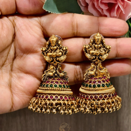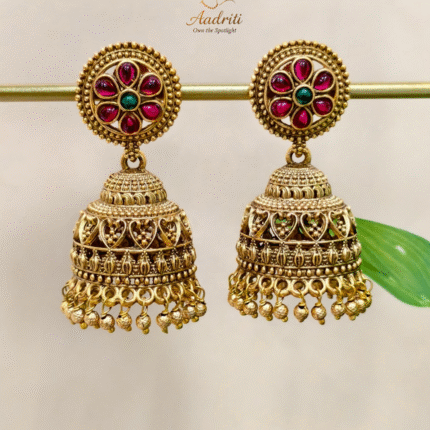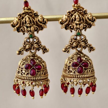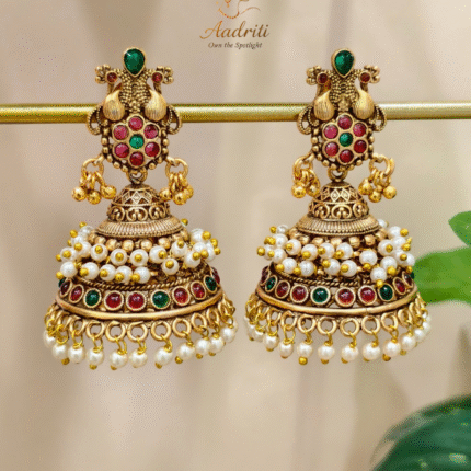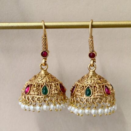A stunning antique-finish temple jhumka adorned with ruby, emerald, and pearl accents. Perfect for weddings and festive looks.