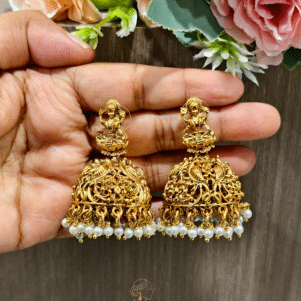 These handcrafted temple jhumkas bring a rich heritage feel with intricate nakashi detailing, studded ruby and emerald stones, and delicate pearl hangings. Their royal, traditional design makes them a perfect pick for weddings, festive outfits, and any occasion where you want to shine with classic elegance. Lightweight yet luxurious, this piece beautifully blends tradition and sophistication.