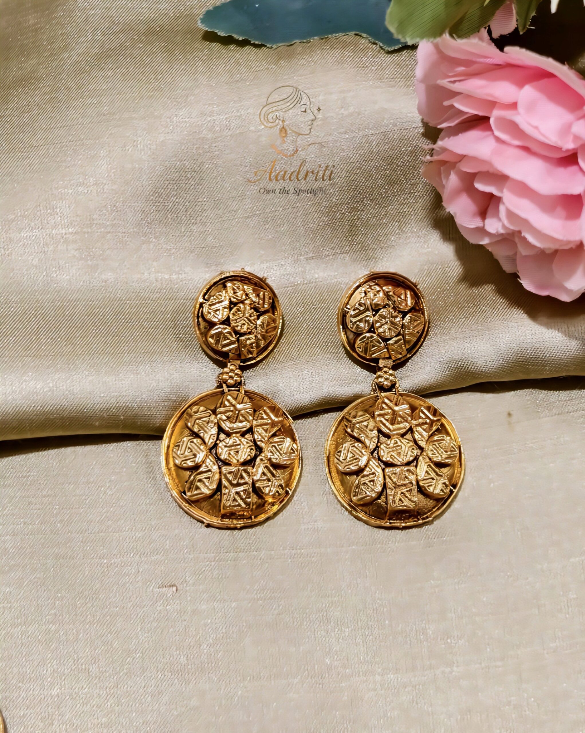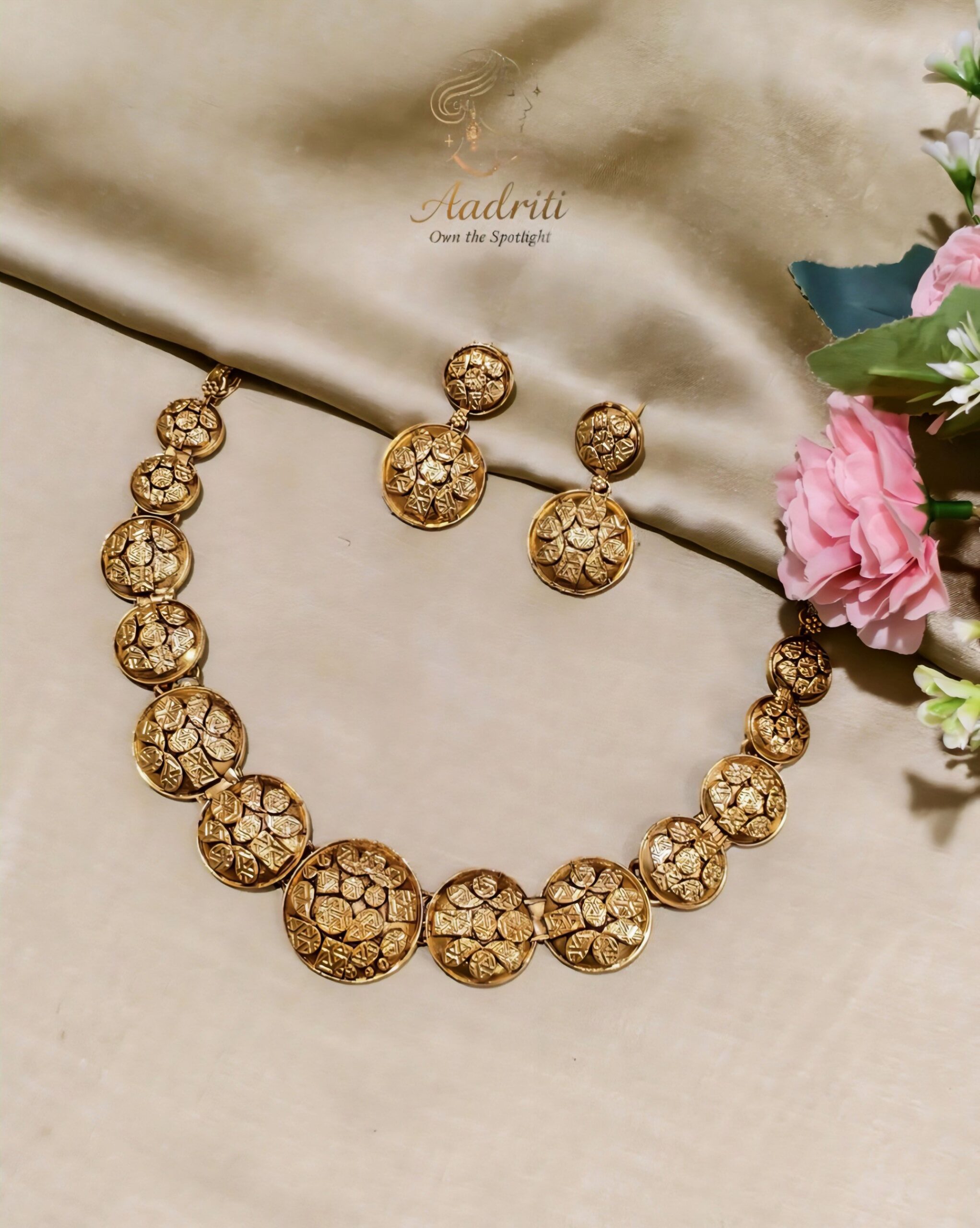 A stunning antique-style necklace set crafted with intricate floral coin motifs. Perfect for weddings, festive occasions, and traditional celebrations, this timeless design adds a touch of elegance and heritage charm to your look.