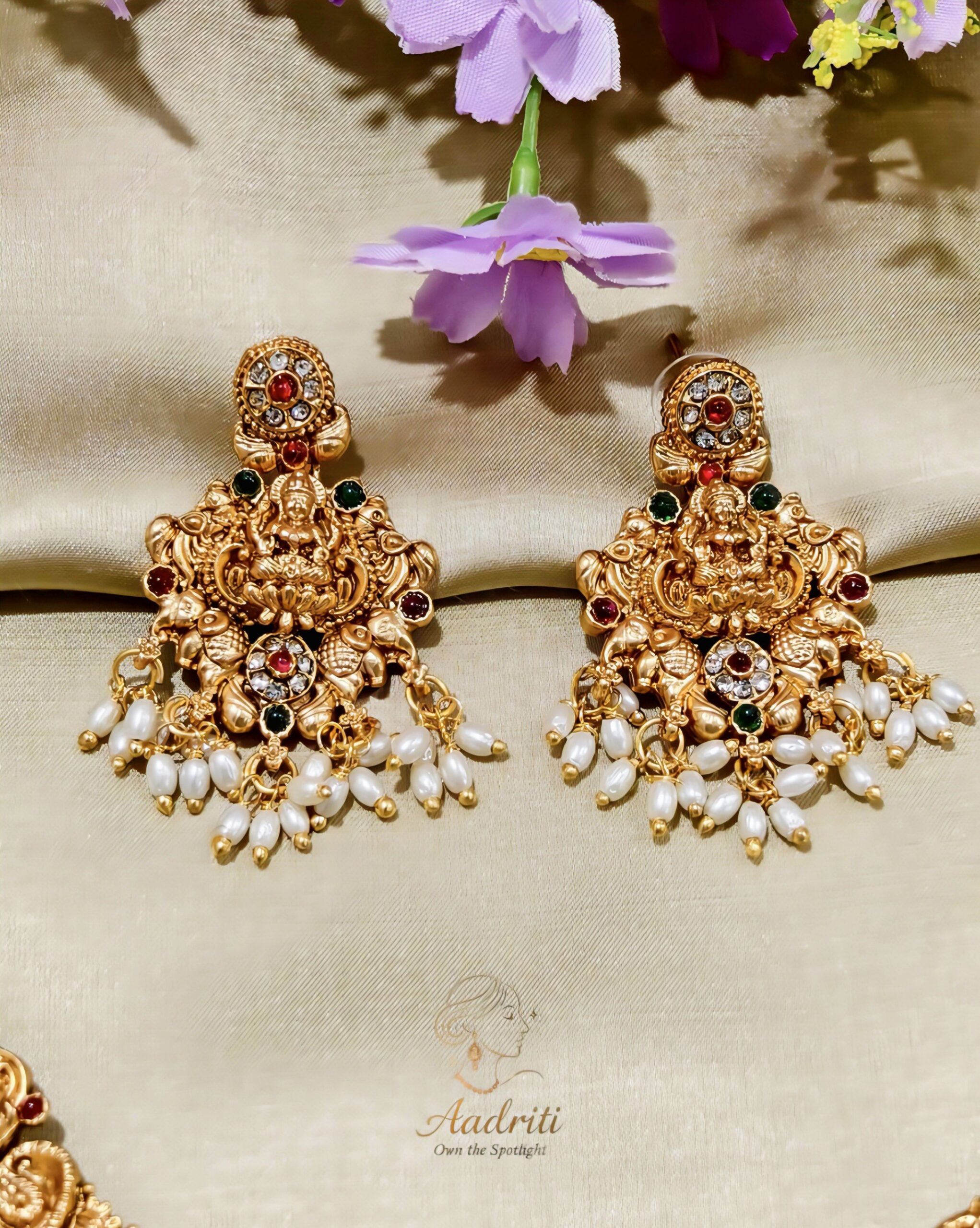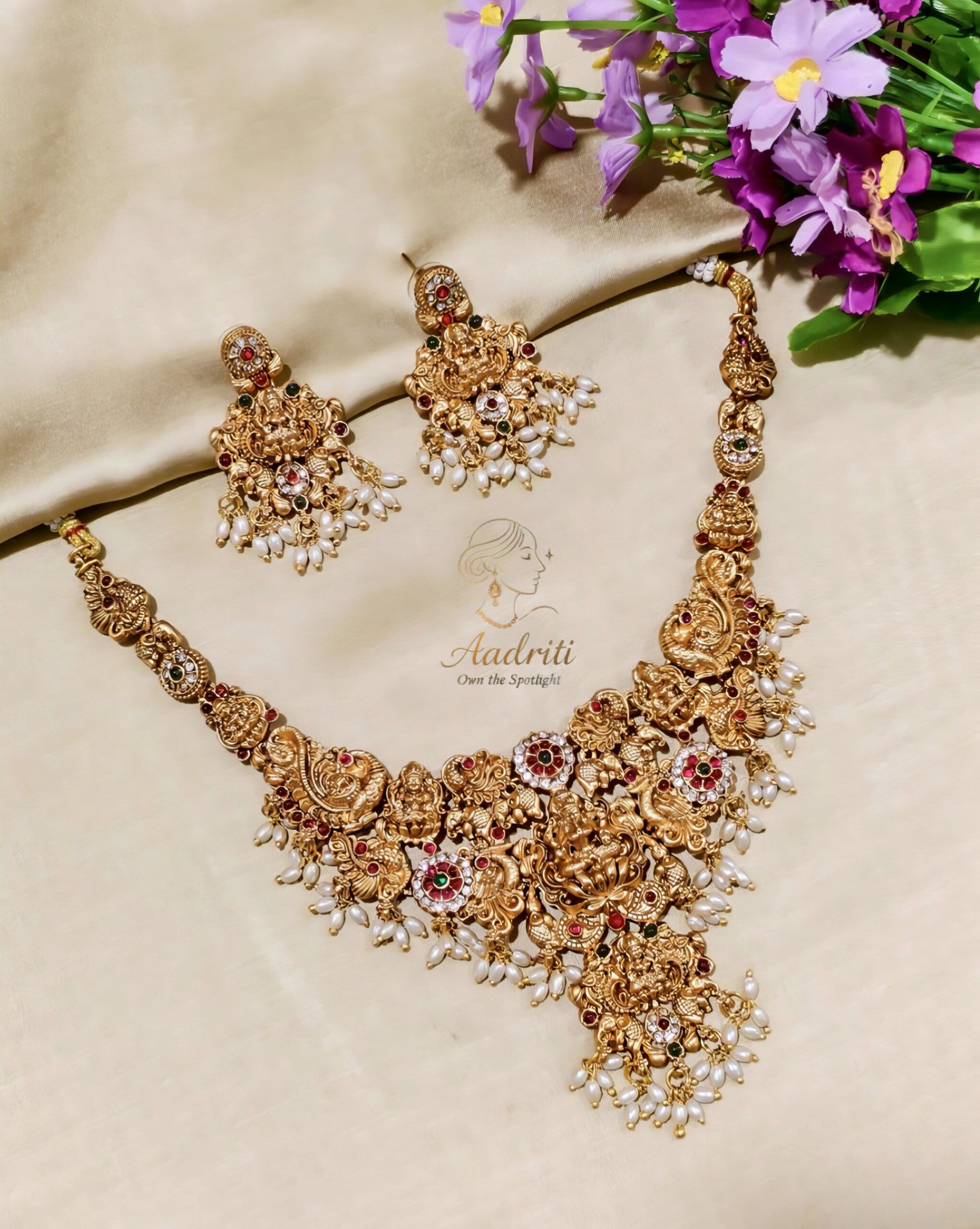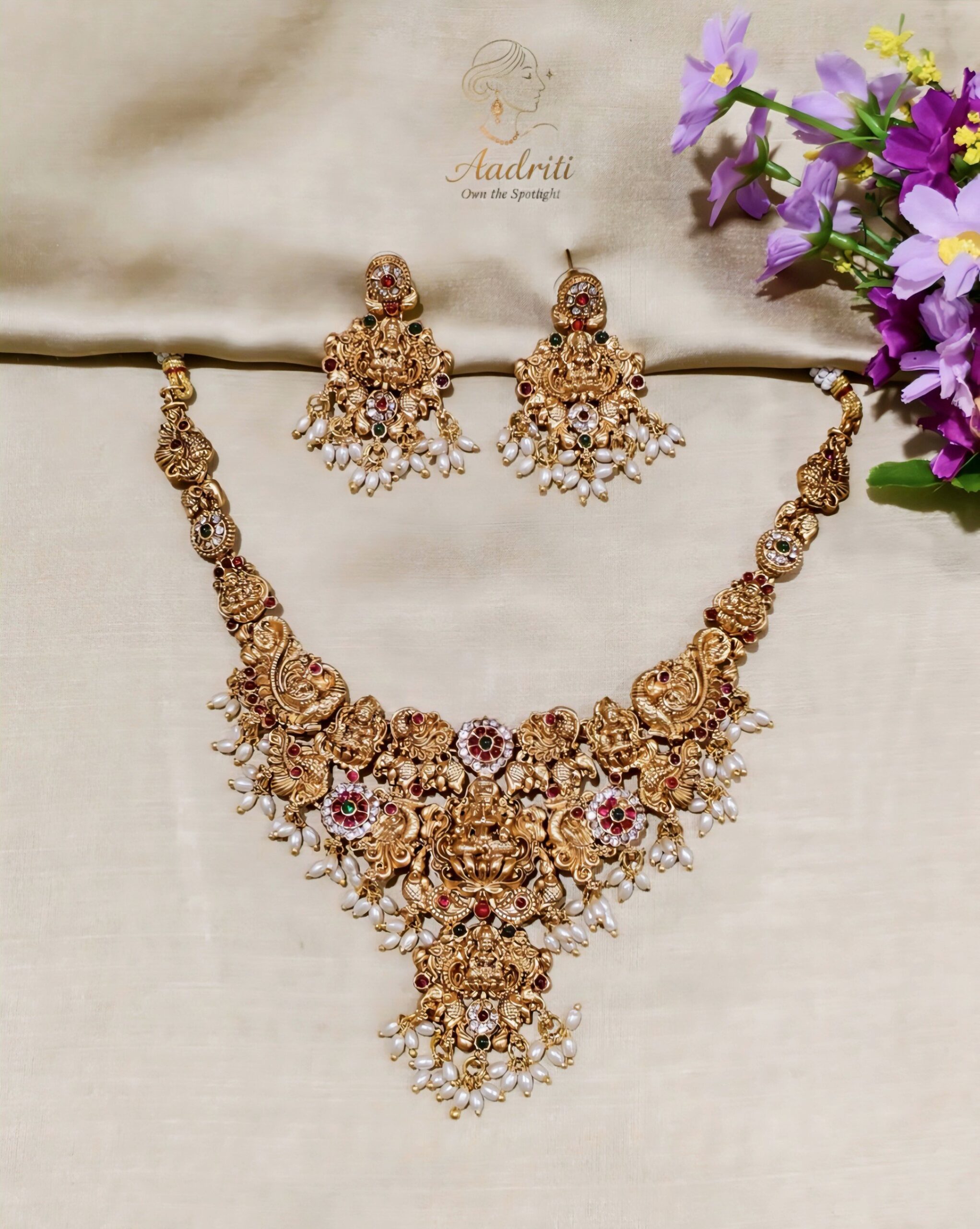 “Antique temple jewellery set with goddess design, red & green stones, and pearl drops – perfect for weddings and festive occasions.”