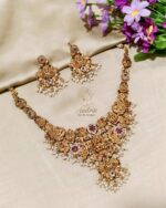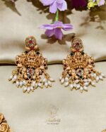 A stunning antique temple jewellery set featuring intricate goddess motifs, embellished with red and green stones, and adorned with delicate pearl drops. Perfect for bridal wear, festive occasions, and traditional celebrations, this necklace with matching earrings adds a touch of divine elegance to your look.
