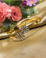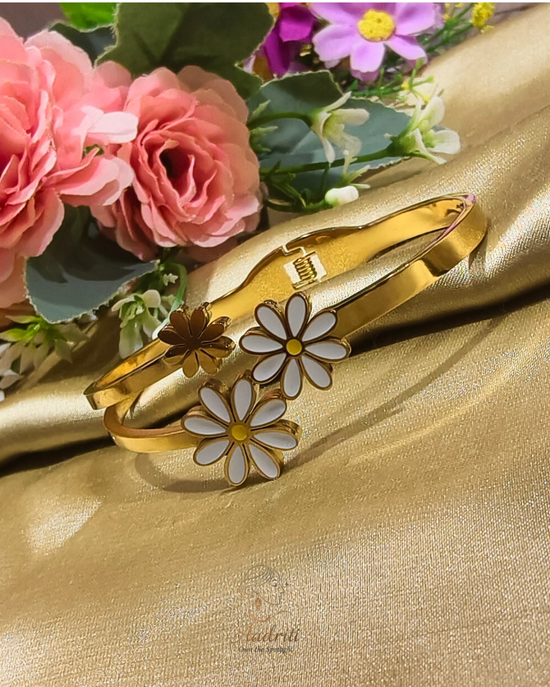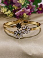 Add a touch of floral elegance to your look with our beautifully crafted Daisy Anti-Tarnish Bracelet. Designed with dual daisy motifs, this bracelet combines a glossy gold finish with white enamel petals that stand out effortlessly. Made with high-quality anti-tarnish coating, it promises long-lasting shine and durability, even with regular use.