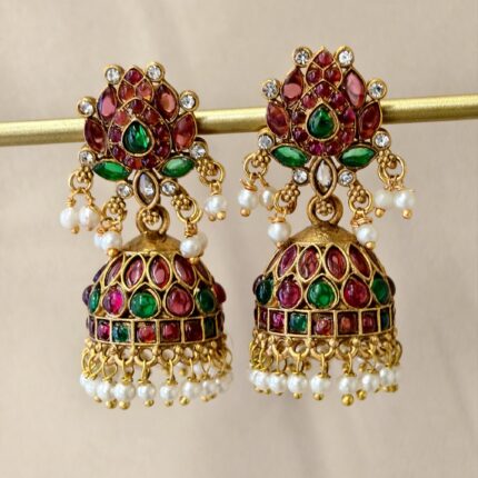 Antique gold temple Jhumkas with goddess motifs, embellished with red -green stones and pearl drops-a perfect blend of tradition and elegance.