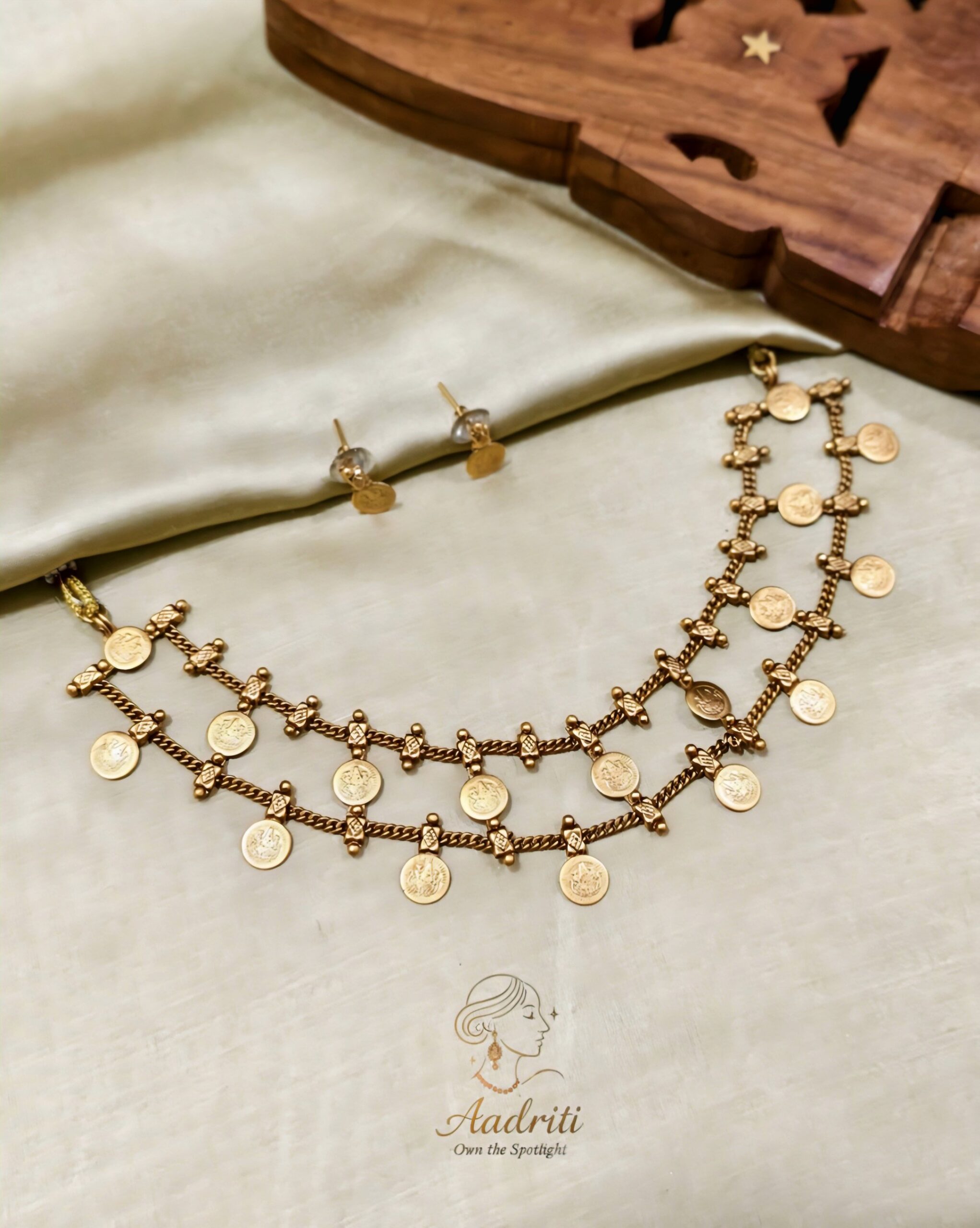 Elevate your traditional look with this stunning antique coin necklace, featuring intricate dual-layer design and matching coin stud earrings. Perfect for festive occasions and ethnic celebrations, this elegant set adds a touch of vintage charm and timeless grace to your outfit.