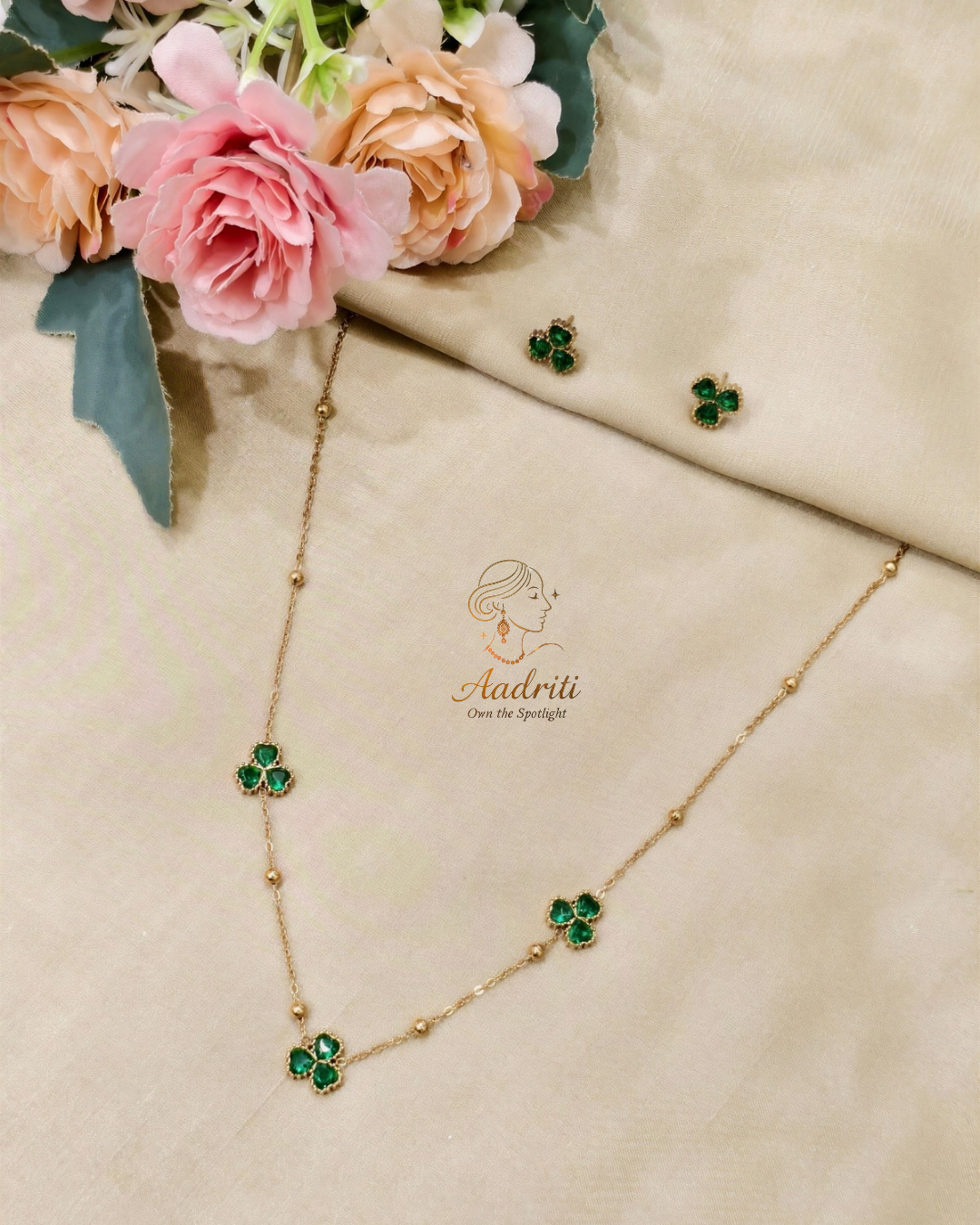 Delicate and timeless, the Emerald Bloom Chain features dainty floral motifs adorned with rich green stones, adding a subtle touch of elegance to your everyday and festive looks.