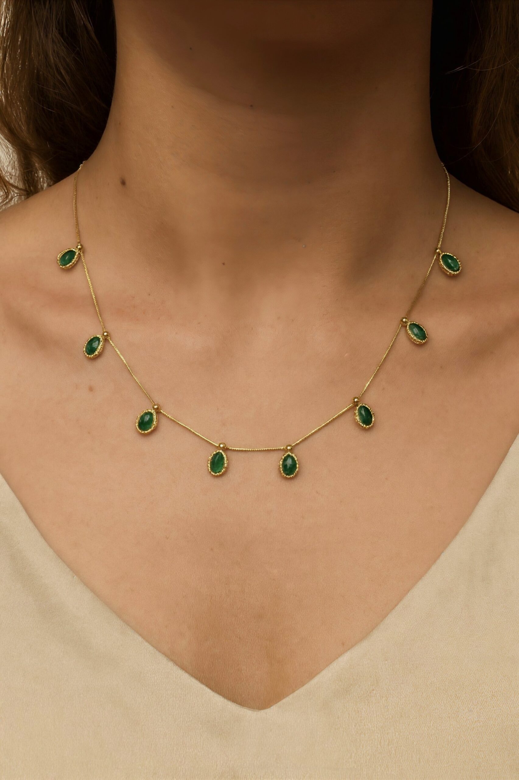 Elevate your everyday look with our stunning Anti-Tarnish Green Droplet Necklace. Designed with a fine gold-toned chain and adorned with multiple emerald-green oval charms, this piece brings a graceful sparkle to your neckline. Each charm is bordered with a textured gold frame, giving it a classy and refined finish.