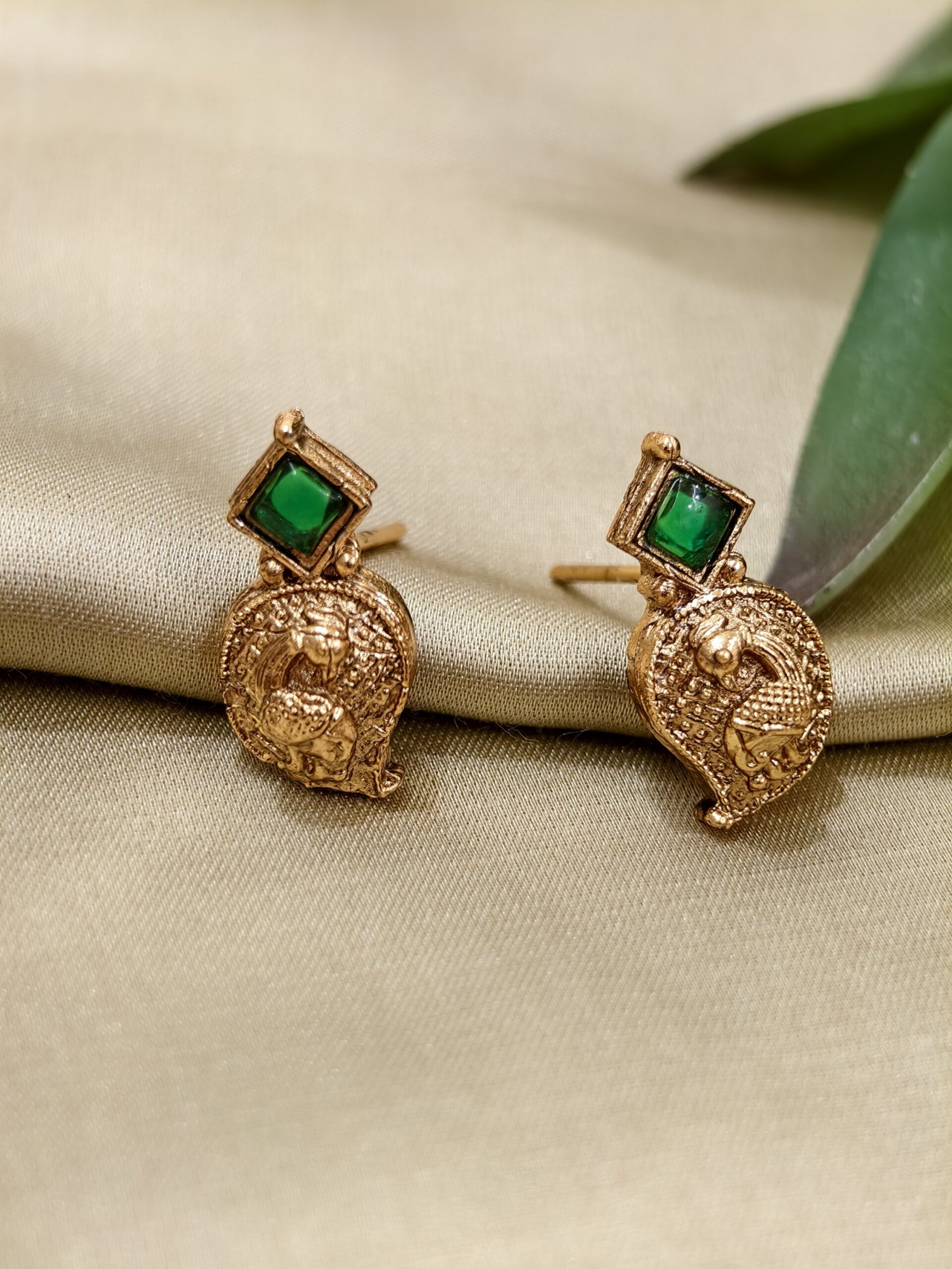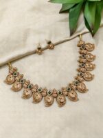 Adorn yourself with this exquisite temple jewellery necklace, featuring intricate Goddess motifs and peacock designs, highlighted with green stones. Perfect for weddings, festive occasions, and traditional celebrations, this timeless piece adds grace and grandeur to your ethnic look.