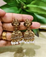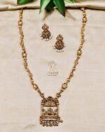 This exquisite imitation temple jewellery set features a beautifully crafted long necklace with intricate motifs and a matching pair of jhumka earrings.