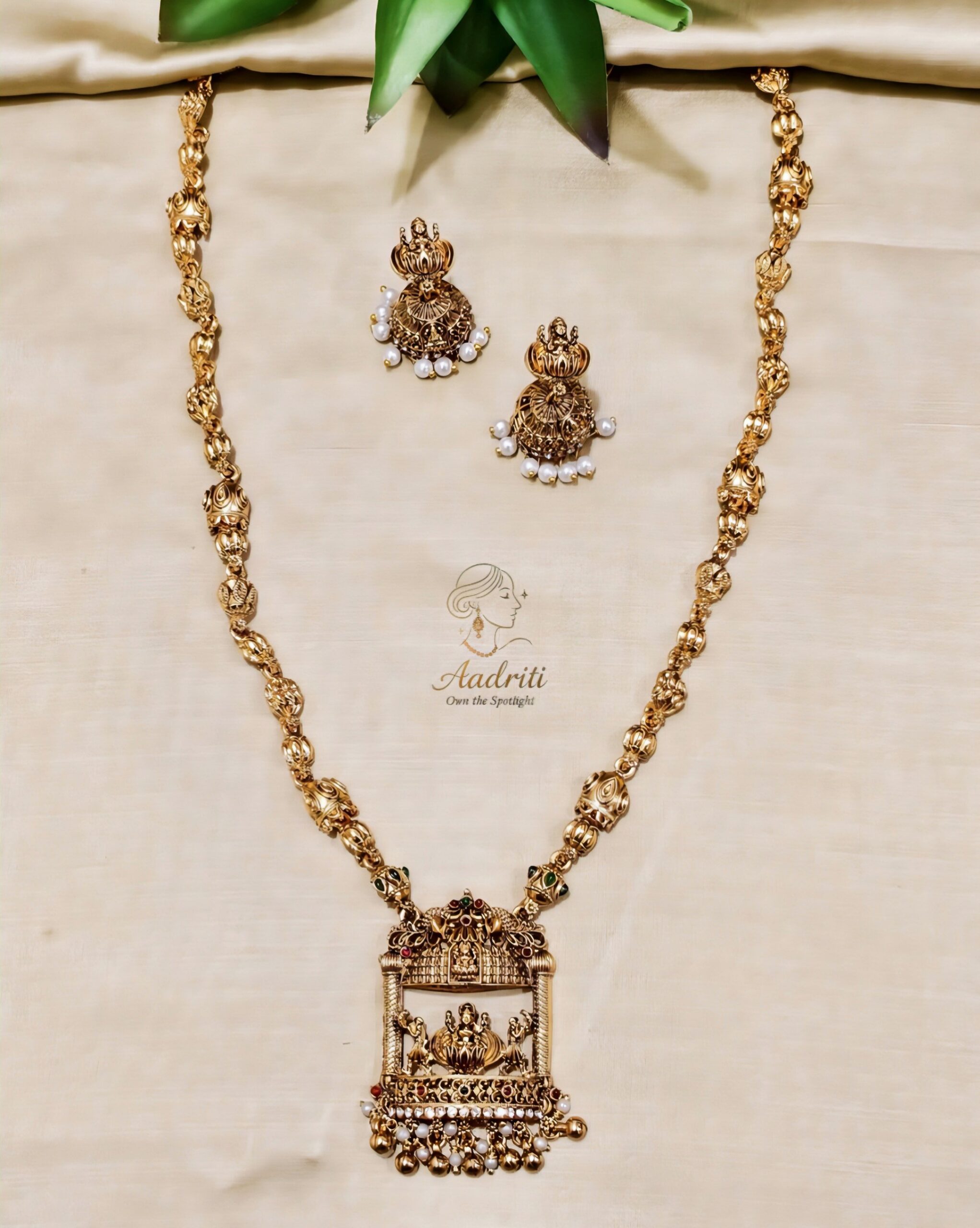 Beautiful traditional temple jewellery set with a long necklace and matching jhumka earrings.