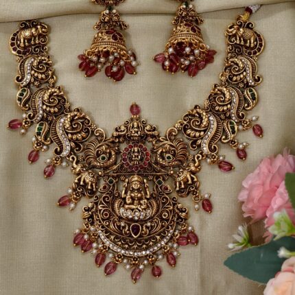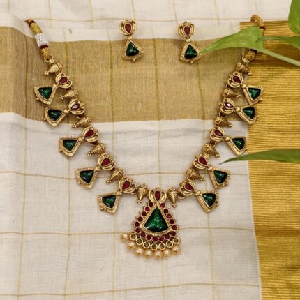 Graceful lotus-inspired jewellery set, crafted with a touch of tradition and finished with delicate pearl drops. A perfect blend of elegance and charm for festive and special occasions.