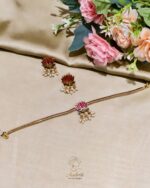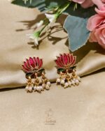 Add a touch of elegance to your look with this lotus-inspired jewellery set. Designed with intricate enamel work and adorned with delicate pearl drops, it beautifully blends tradition with modern grace — ideal for festive occasions, weddings, or special celebrations.