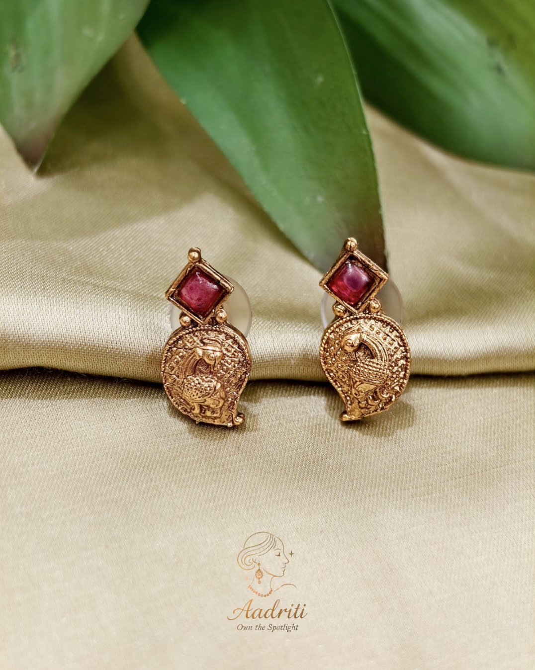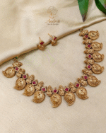 Adorn yourself with this exquisite temple jewellery necklace, featuring intricate Goddess motifs and peacock designs, highlighted with ruby-red stones. Perfect for weddings, festive occasions, and traditional celebrations, this timeless piece adds grace and grandeur to your ethnic look.