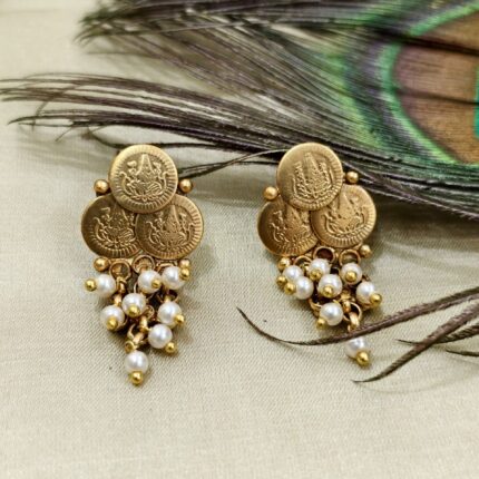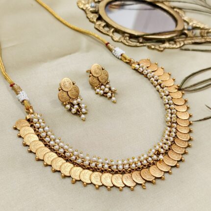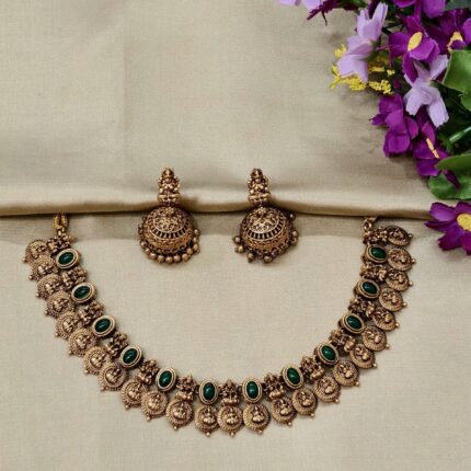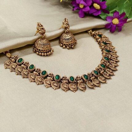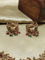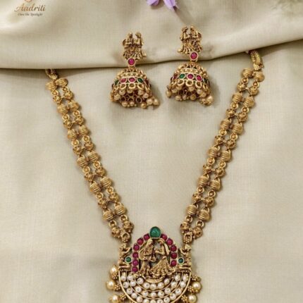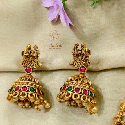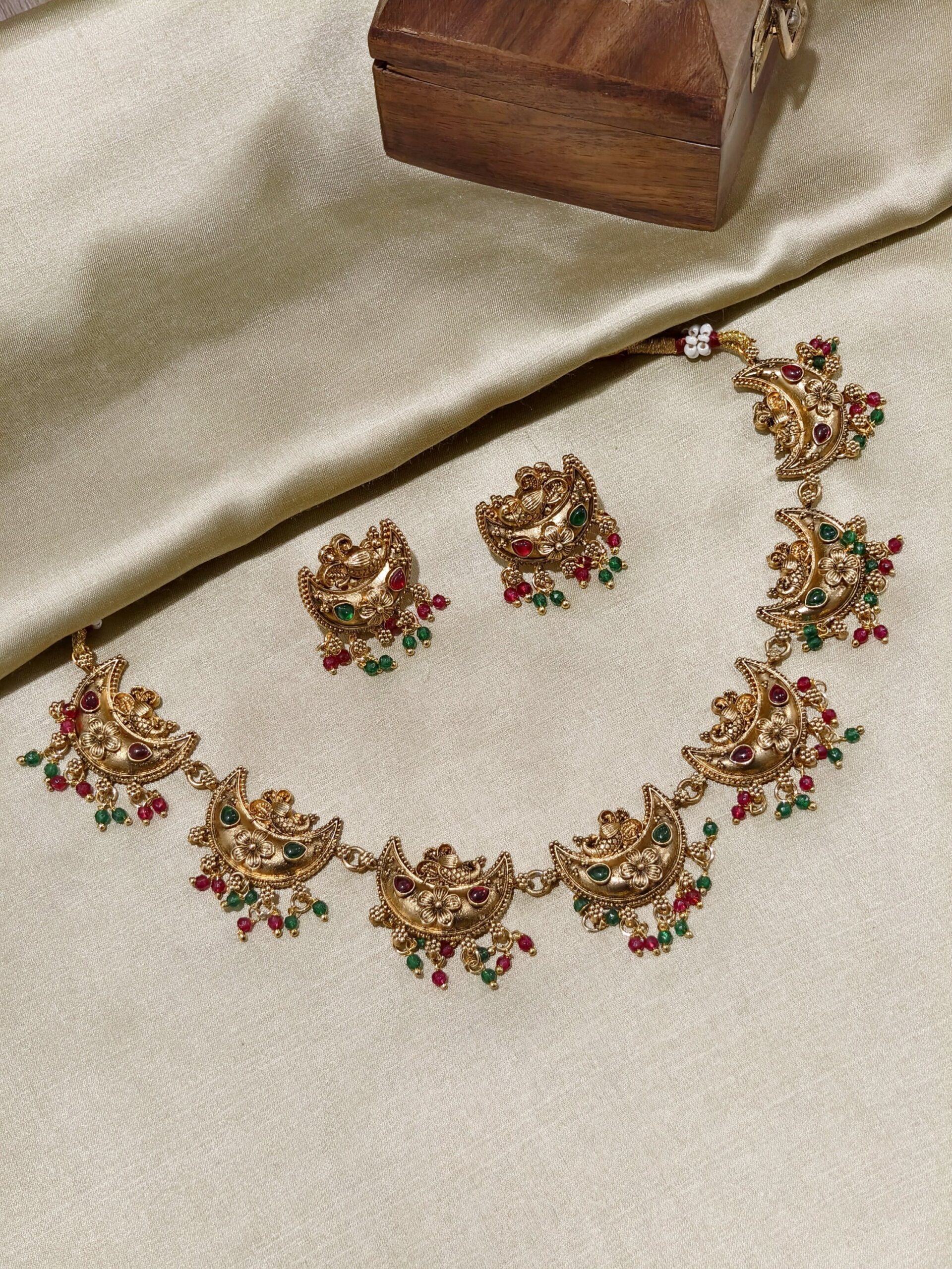 Adorn yourself with Aadriti’s Golden Moon Necklace Set, featuring antique gold crescent motifs embellished with red and green stones — a perfect blend of tradition and timeless charm.