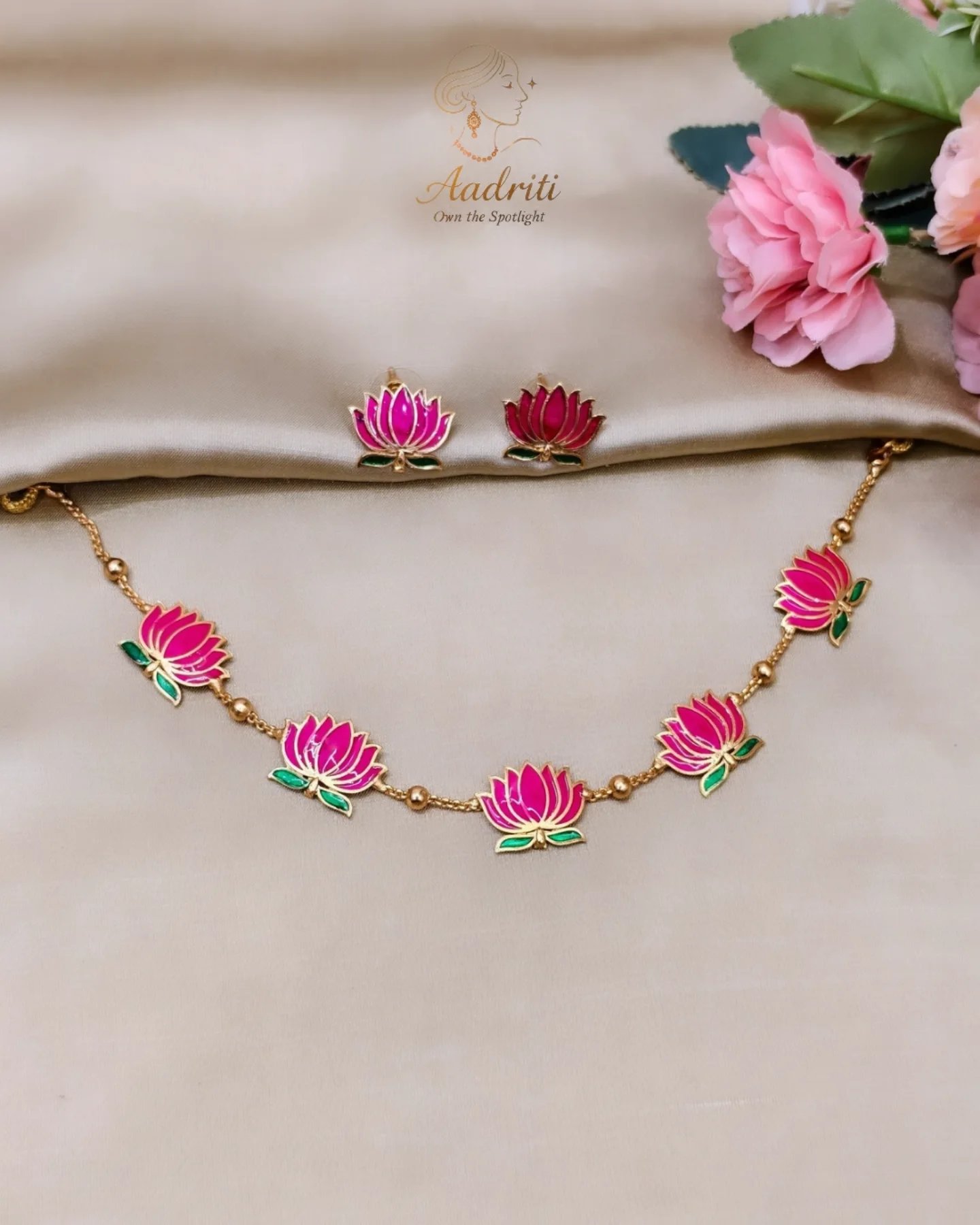 Adorn yourself with the charm of blooming beauty! 🌸 This handcrafted necklace set features vibrant pink lotus motifs with delicate green detailing, symbolizing purity, grace, and elegance.
