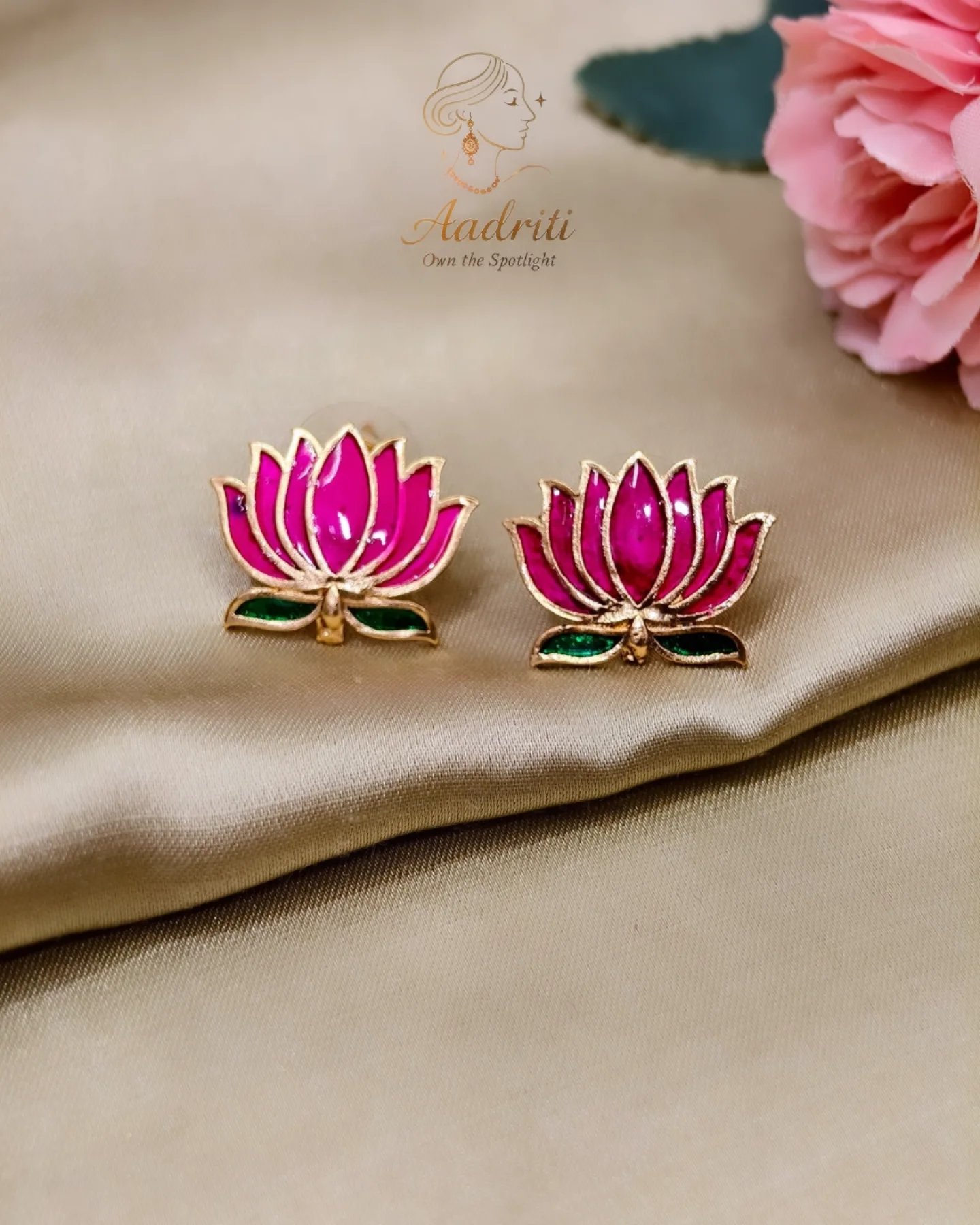 Adorn yourself with the charm of blooming beauty! 🌸 This handcrafted necklace set features vibrant pink lotus motifs with delicate green detailing, symbolizing purity, grace, and elegance. Paired with matching studs, it’s perfect for festive occasions, traditional wear, or adding a touch of elegance to your everyday style.