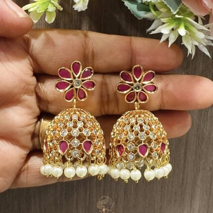 Adorned with ruby and emerald accents, the Royal Radiance Jhumkas embody classic elegance. The intricate gold detailing paired with shimmering white stones and delicate pearl drops creates a mesmerizing look, perfect for festive occasions and grand celebrations. Crafted to make you stand out, these jhumkas are a statement of tradition, grace, and luxury — just like you.