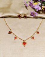 Elegant gold-toned necklace set with matching studs, featuring vibrant red stone accents in a delicate leaf-shaped design. A perfect blend of tradition and modern charm, ideal for festive and special occasions. ✨
